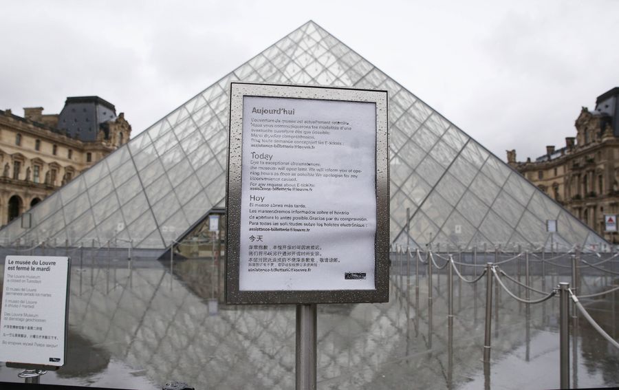 The closing notice is seen at Louvre Museum in Paris, France, March 2, 2020. The Louvre Museum in Paris was closed for a second day running on Monday due to the spreading coronavirus epidemic. (Xinhua/Gao Jing)