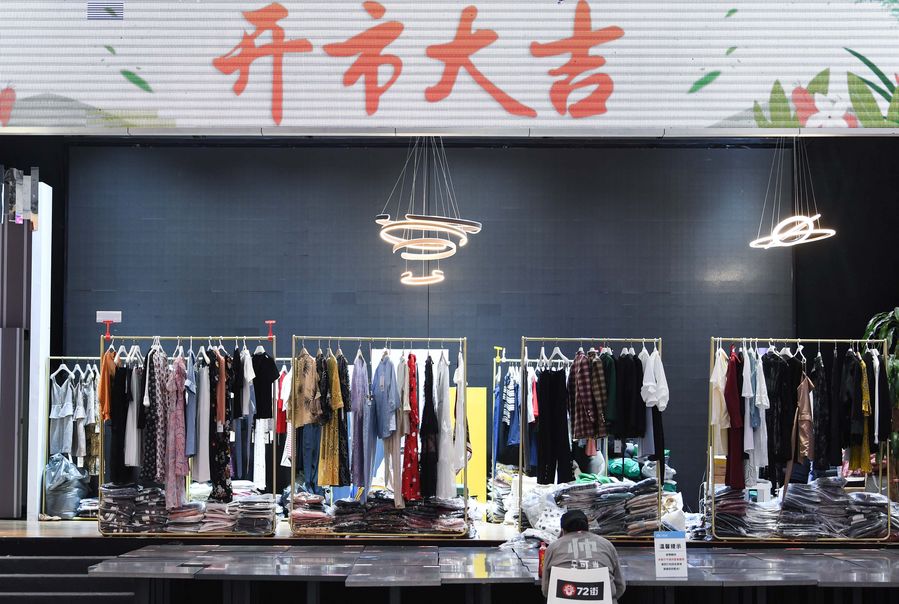 Words for good blessings is seen at Baima Garment Market in Guangzhou, south China's Guangdong Province, March 5, 2020. (Xinhua/Deng Hua)