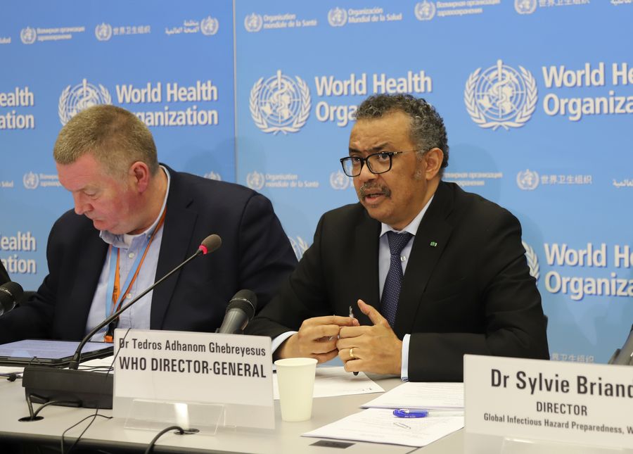 The World Health Organization (WHO) Director-General Tedros Adhanom Ghebreyesus (R) attends a daily briefing in Geneva, Switzerland, Feb. 24, 2020. (Xinhua/Chen Junxia)