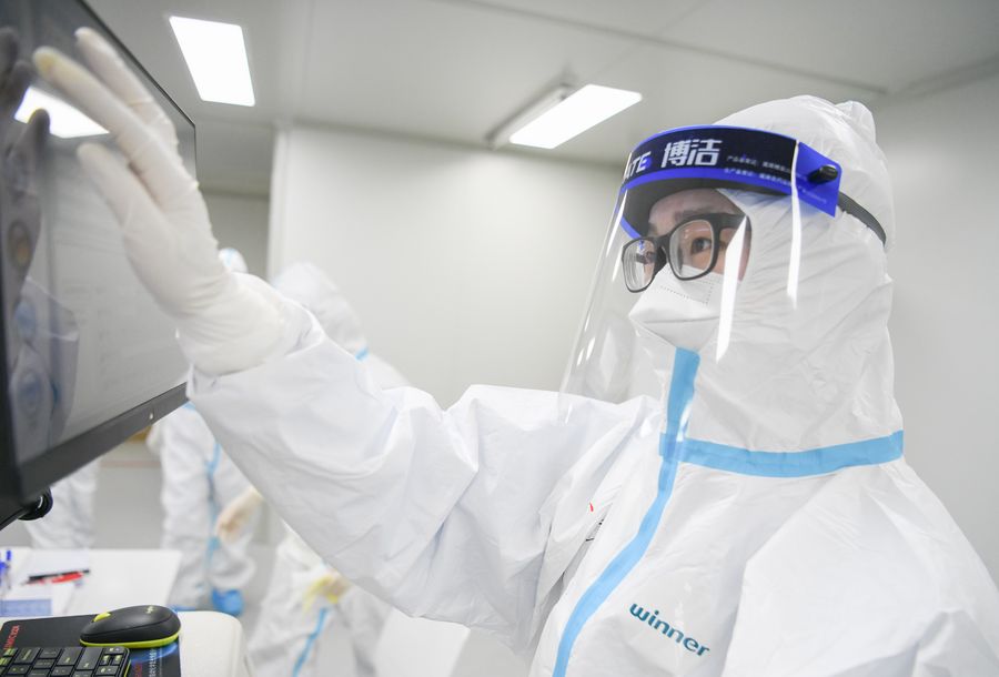 Chen Yawen from Zhongnan Hospital of Wuhan University conducts detections of the novel coronavirus at the Leishenshan (Thunder God Mountain) Hospital in Wuhan, central China's Hubei Province, March 4, 2020. (Xinhua/Cheng Min)