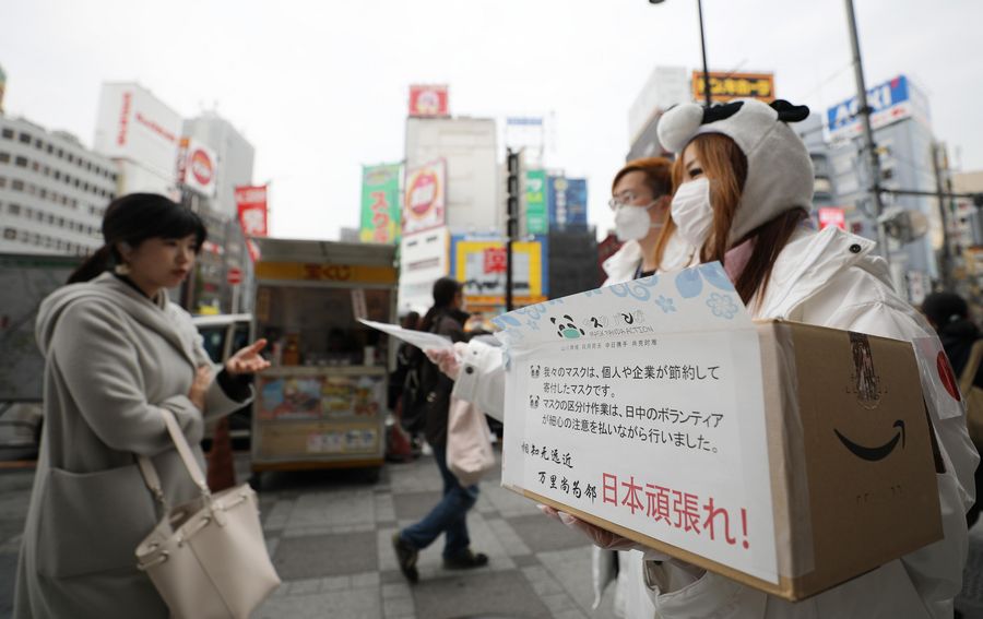 A member (R) of "Mask Panda Action Team", a volunteer group initiated by local Chinese community and later joined by more people in Japan, hands out masks to local people to help with the prevention of the novel coronavirus disease in Tokyo, Japan, Feb. 29, 2020. (Xinhua/Du Xiaoyi)