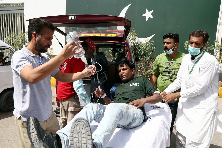 Rescuers transfer a man affected by gas leakage to a hospital in southern Pakistani port city of Karachi on March 6, 2020. (Str/Xinhua)