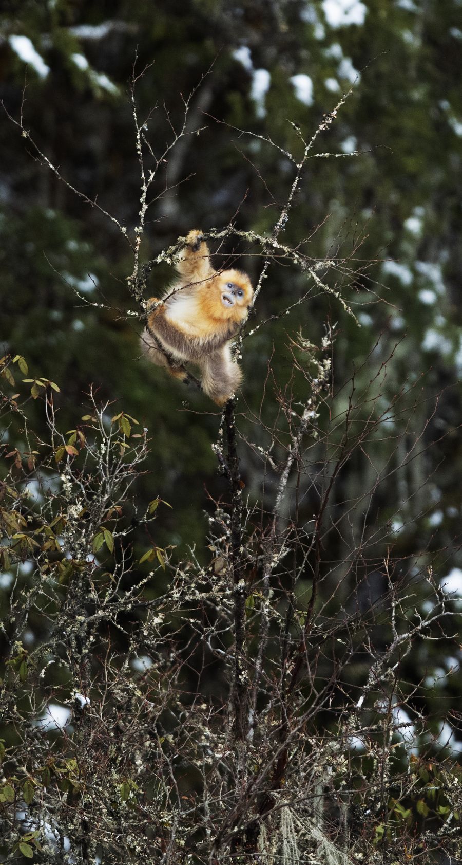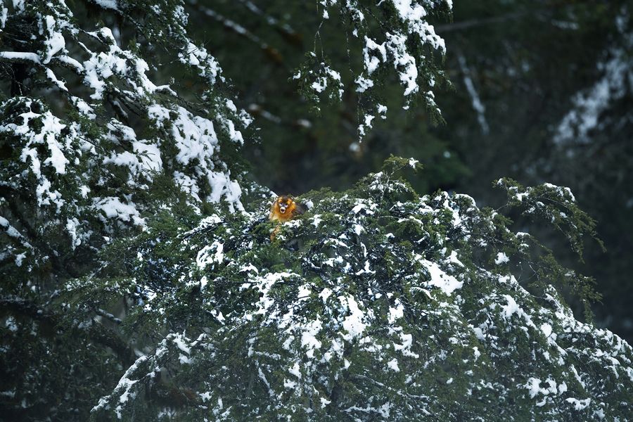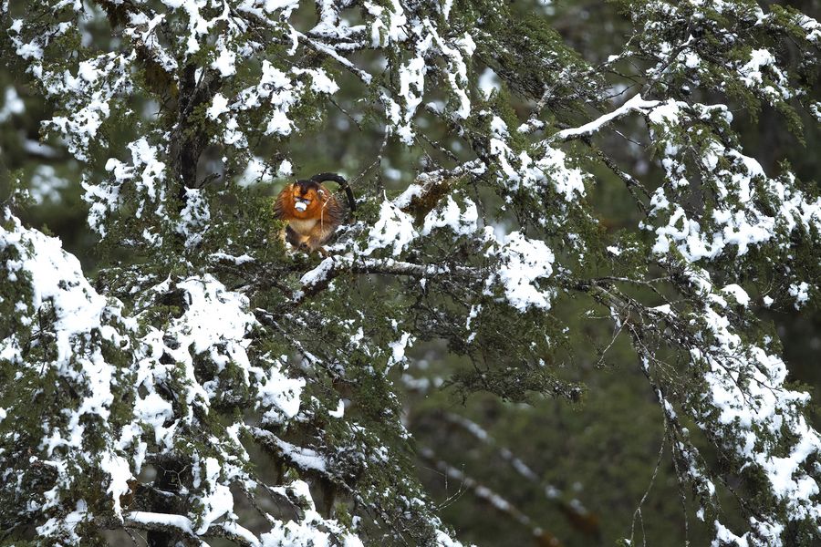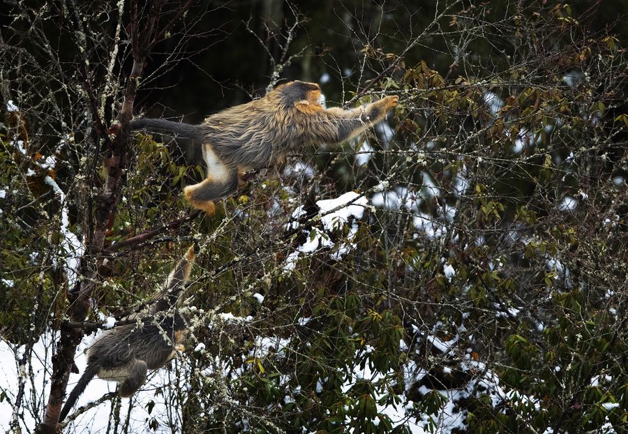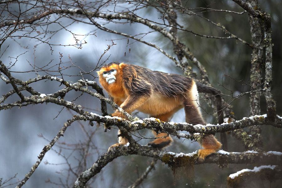 A Sichuan golden snub-nosed monkey is seen on trees of Jiajin Mountain in Baoxing County, southwest China's Sichuan Province, March 5, 2020. (Photo by Gao Huakang/Xinhua)