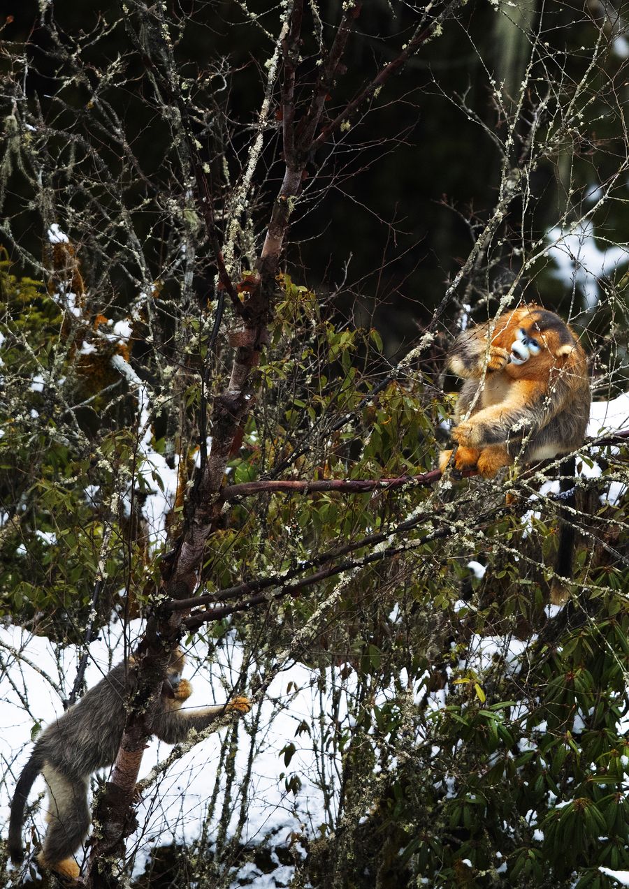 Sichuan golden snub-nosed monkeys are seen on trees of Jiajin Mountain in Baoxing County, southwest China's Sichuan Province, March 5, 2020. (Photo by Gao Huakang/Xinhua)