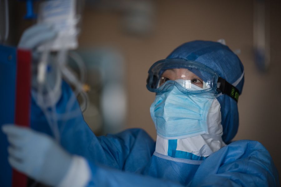 Head nurse Sun Chun works at an ICU ward of the First Hospital of Wuhan City in Wuhan, central China's Hubei Province, Feb. 22, 2020. Sun is among the first batch of medical workers dispatched from the First Hospital to the makeshift hospital of Leishenshan (Thunder God Mountain) in Wuhan. (Xinhua/Xiao Yijiu)