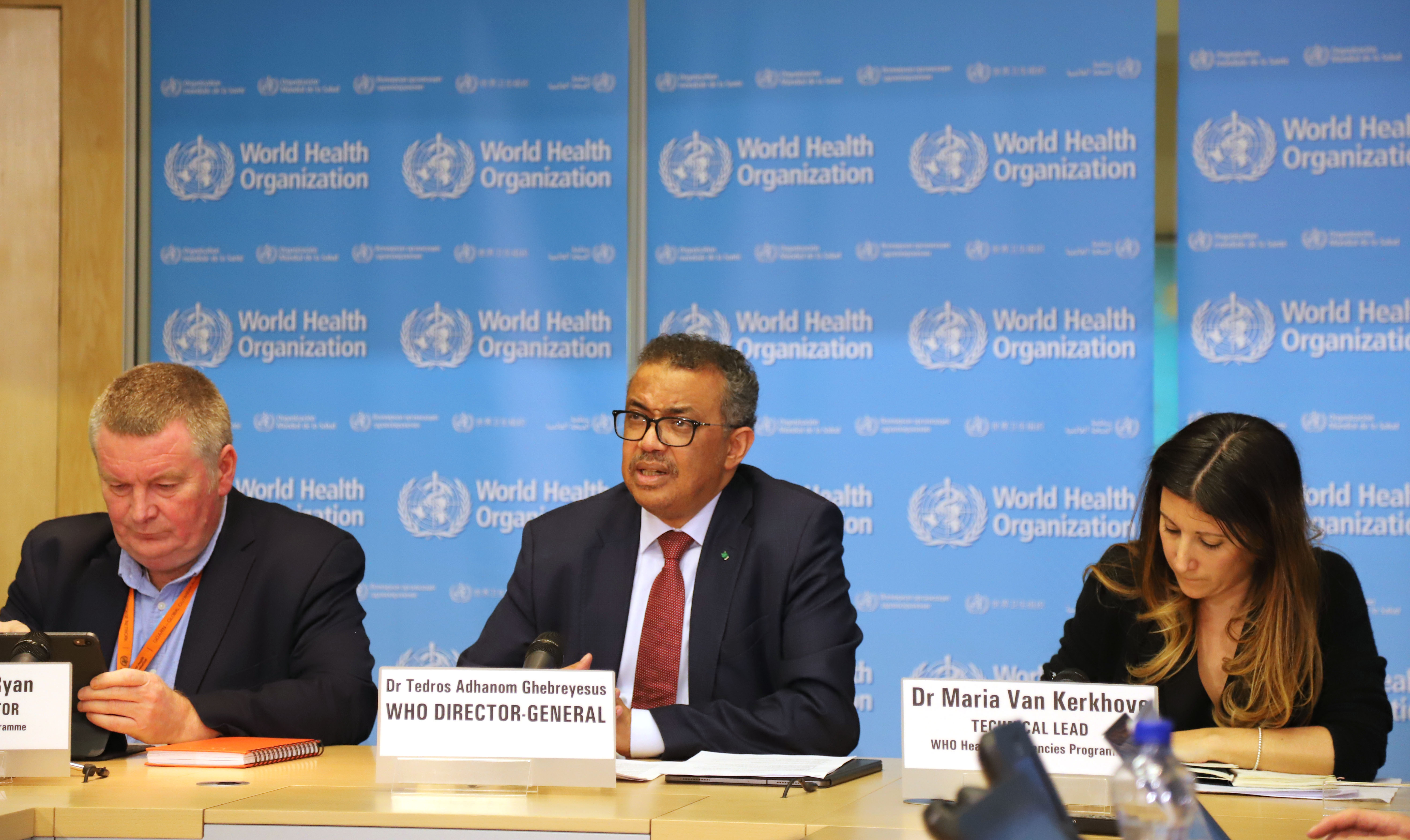 WHO Director-General Tedros Adhanom Ghebreyesus (C) speaks at a daily briefing in Geneva, Switzerland, March 6, 2020. (Xinhua/Chen Junxia)