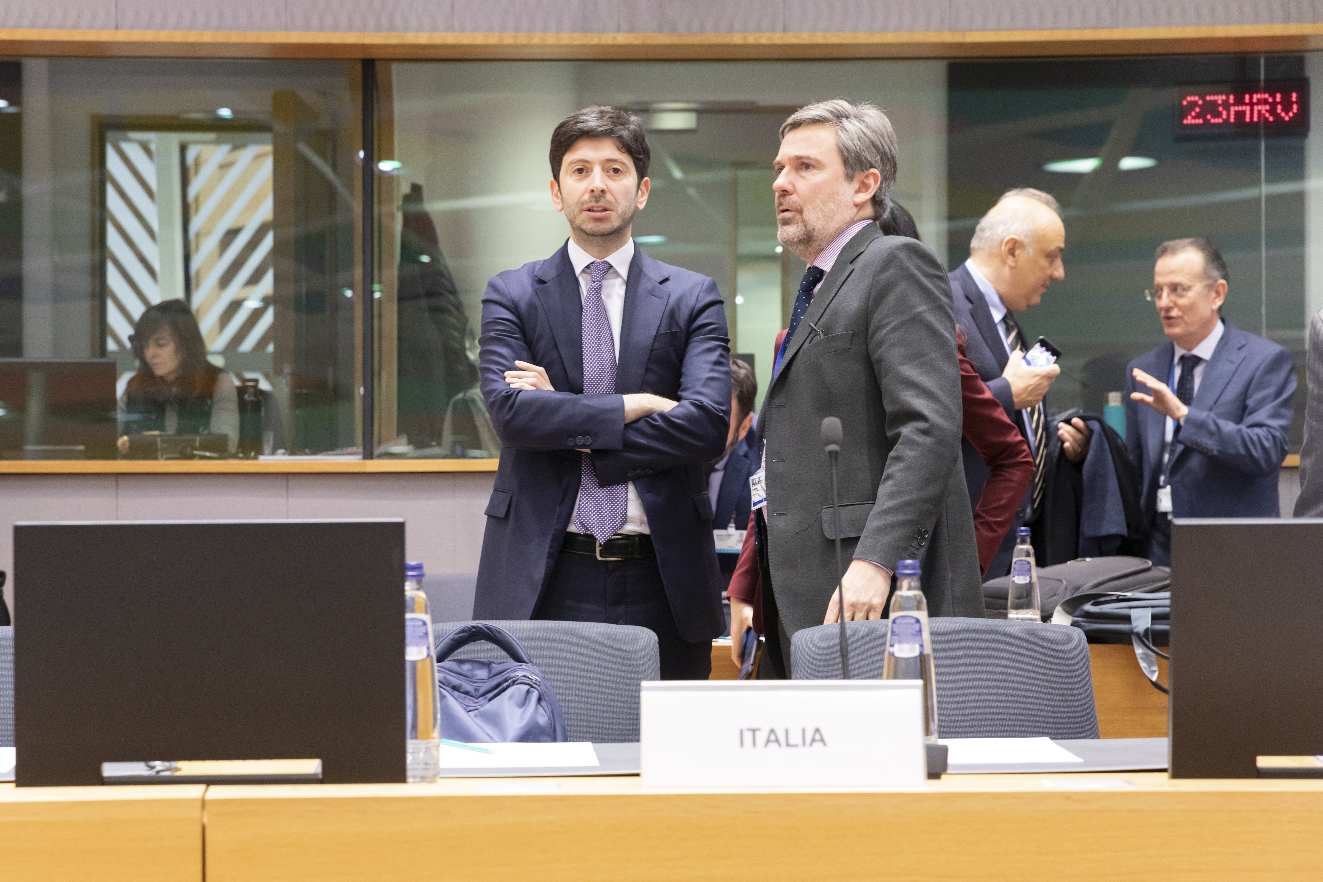 Italian Health Minister Roberto Speranza (L) arrives for the EU Health Affairs Council in Brussels, Belgium, on March 6, 2020. (Photo by Riccardo Pareggiani/Xinhua)