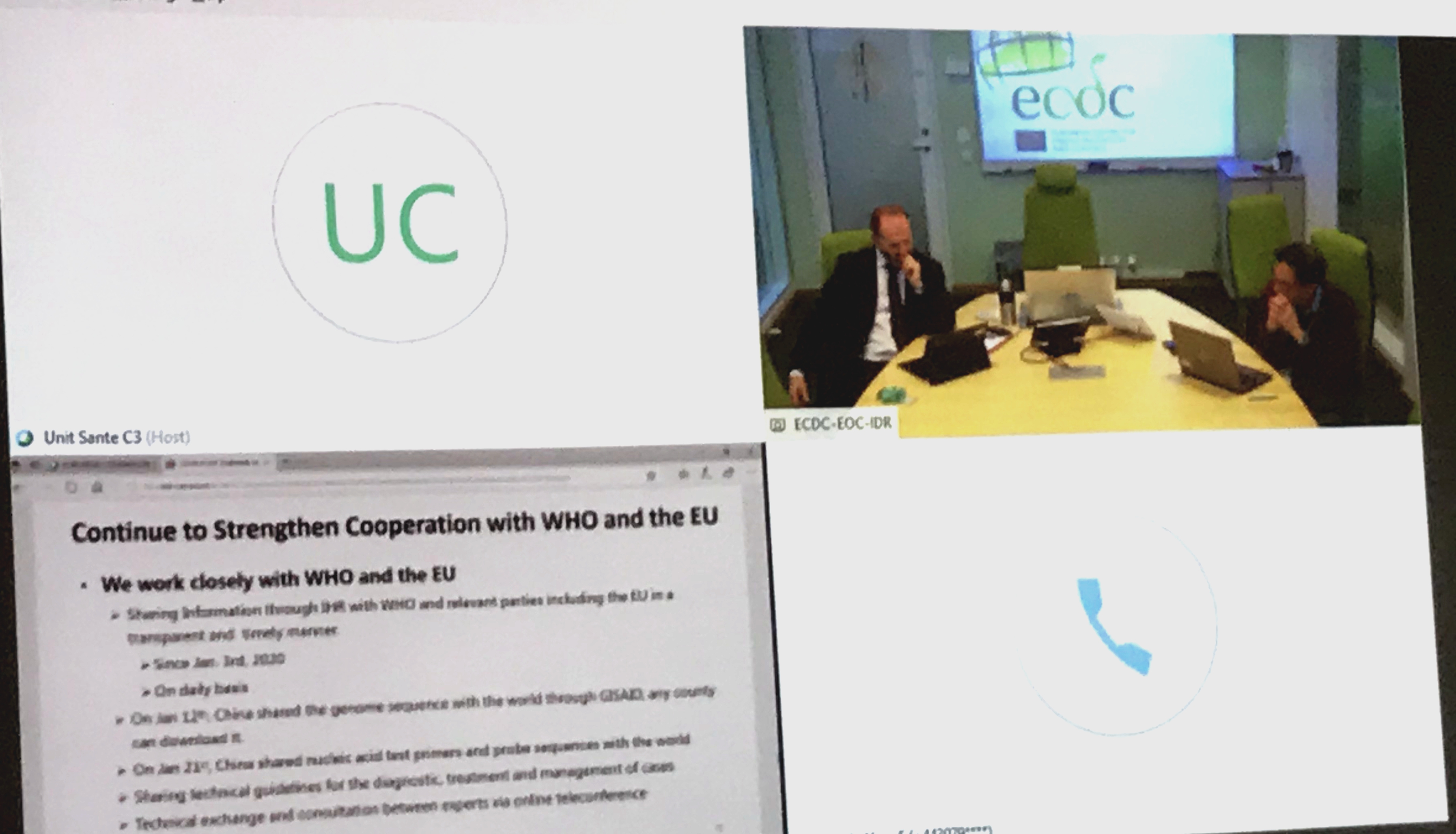 Experts from the European Centre for Disease Prevention and Control attend a video meeting with Chinese experts on response to the COVID-19 in Brussels, Belgium on Feb. 12, 2020. (China Mission to the EU/Handout via Xinhua)