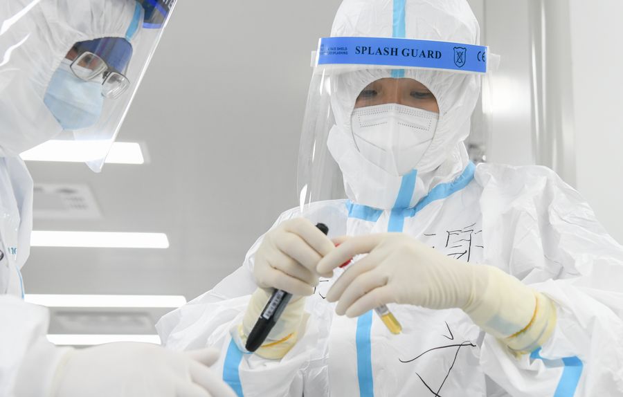 Xie Wen (R) from Zhongnan Hospital of Wuhan University conducts detections at the clinical laboratory of the Leishenshan (Thunder God Mountain) Hospital in Wuhan, central China's Hubei Province, March 4, 2020. The laboratory brought together medical personnel from different hospitals and medical testing institution, most of whom are female. Their work is to test samples collected from COVID-19 patients and provide diagnostic information for doctors. (Xinhua/Cheng Min)