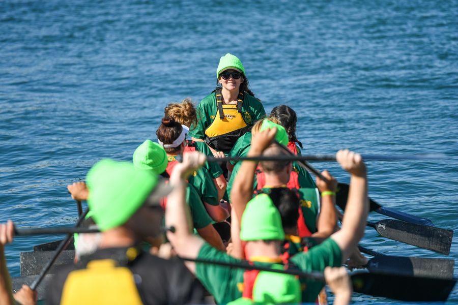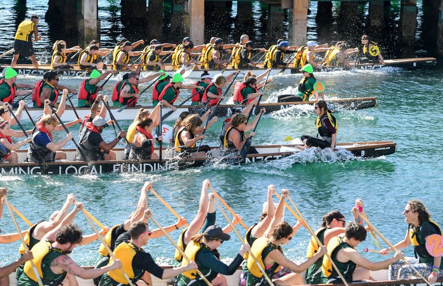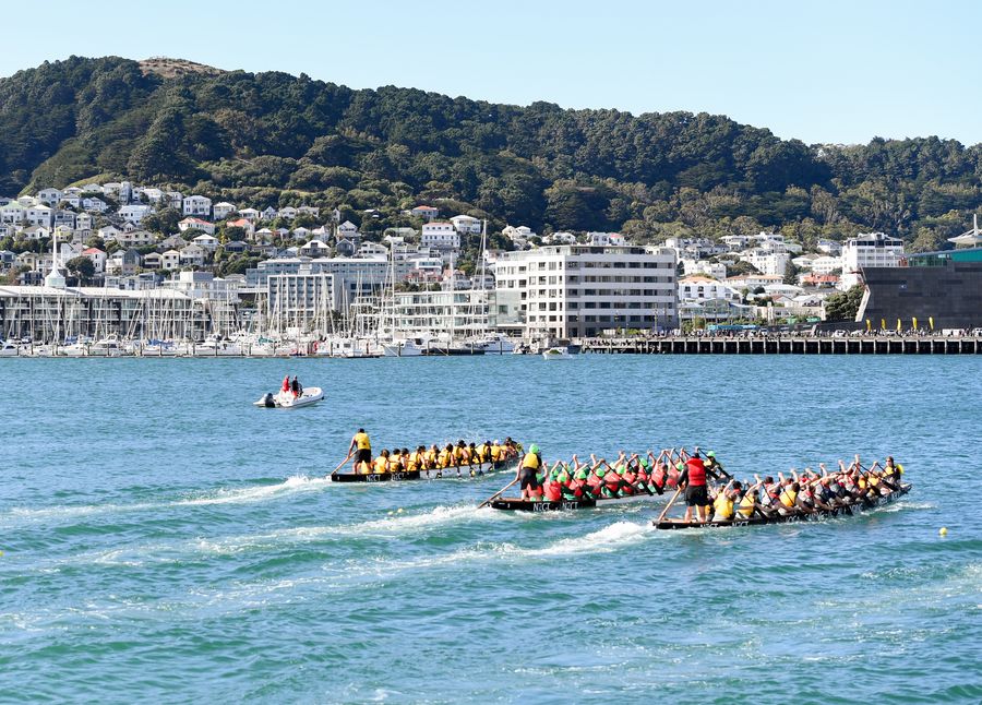 Participants compete during the Dragon Boat Festival in Wellington, New Zealand, March 7, 2020. (Xinhua/Guo Lei)