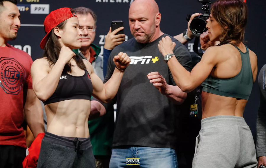 Zhang Weili and Joanna Jedrzejczyk pose before their UFC248 fight in Las Vegas on March 7, 2020. (mmafighting.com)
