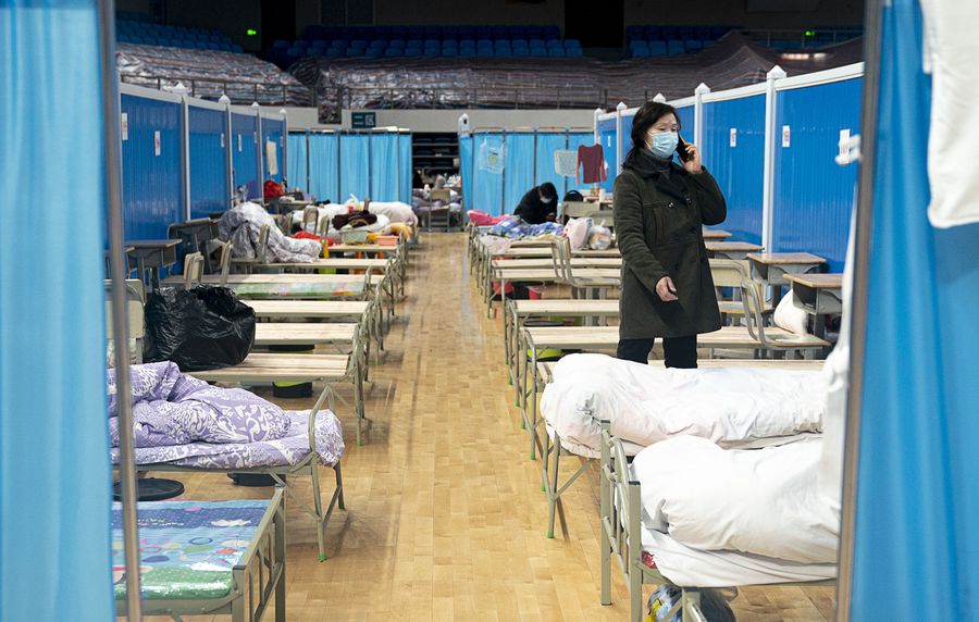 A patient makes phone calls at a makeshift hospital in Wuchang District of Wuhan, central China's Hubei Province, March 8, 2020. (Xinhua/Xiong Qi)