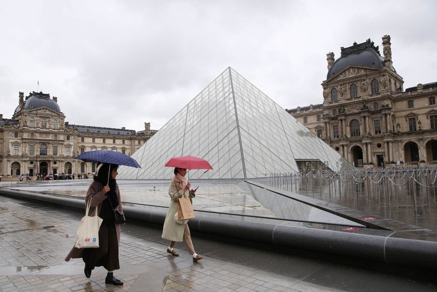 Tourists walk past the Pyramid of the Louvre Museum in Paris, France, March 2, 2020. The Louvre Museum in Paris was closed for a second day running on Monday due to the spreading coronavirus epidemic. (Xinhua/Gao Jing)