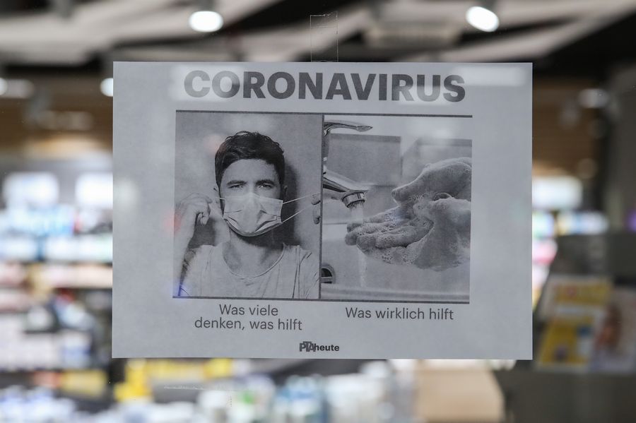 A poster calling on more hand washing instead of purchasing masks is seen at a pharmacy in Berlin, capital of Germany, March 3, 2020. (Xinhua/Shan Yuqi)