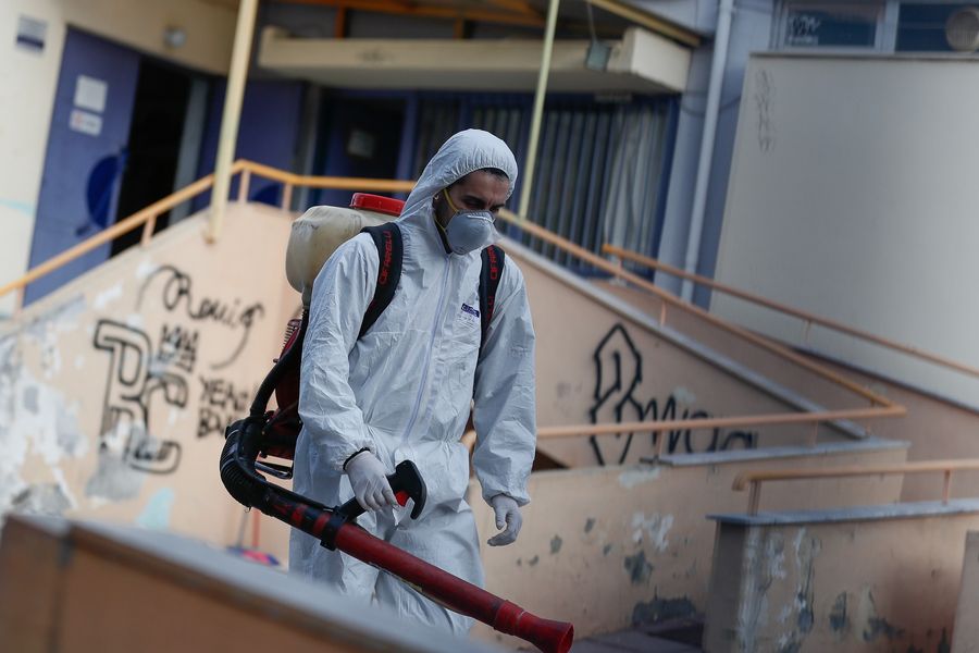 A man wearing a protective suit decontaminates a primary school where a child was diagnosed with coronavirus in Thessaloniki, Greece, Feb. 27, 2020. (Photo by Dimitris Tosidis/Xinhua)