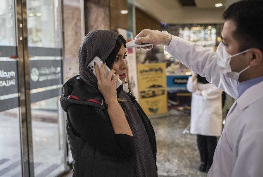 A security staff member checks a customer's temperature at the entrance of a shopping center in northern Tehran, Iran, on March 5, 2020. (Photo by Ahmad Halabisaz/Xinhua)