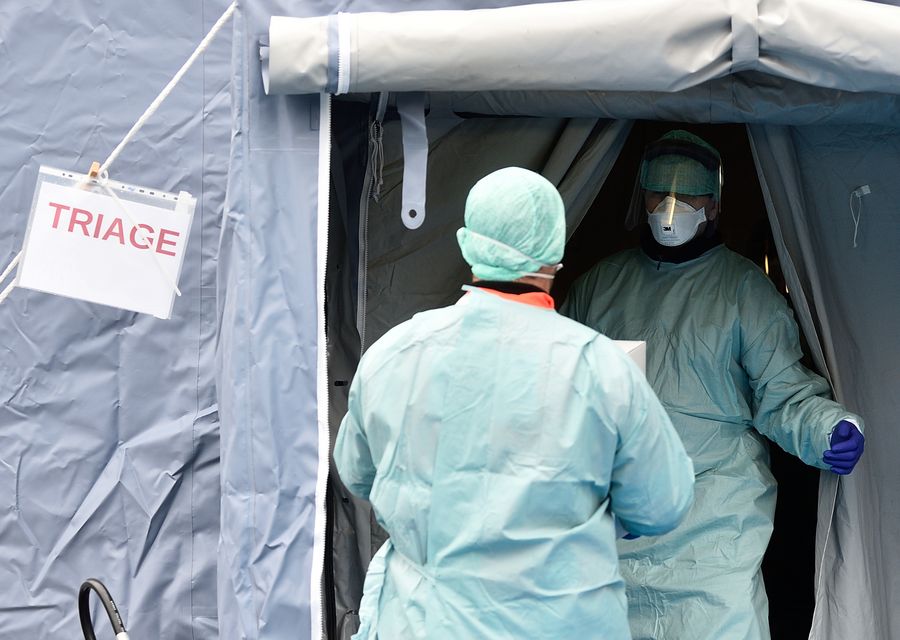 Paramedics work in a tent outside the Brescia Civilians Hospital in Brescia, Italy, March 3, 2020. (Xinhua)
