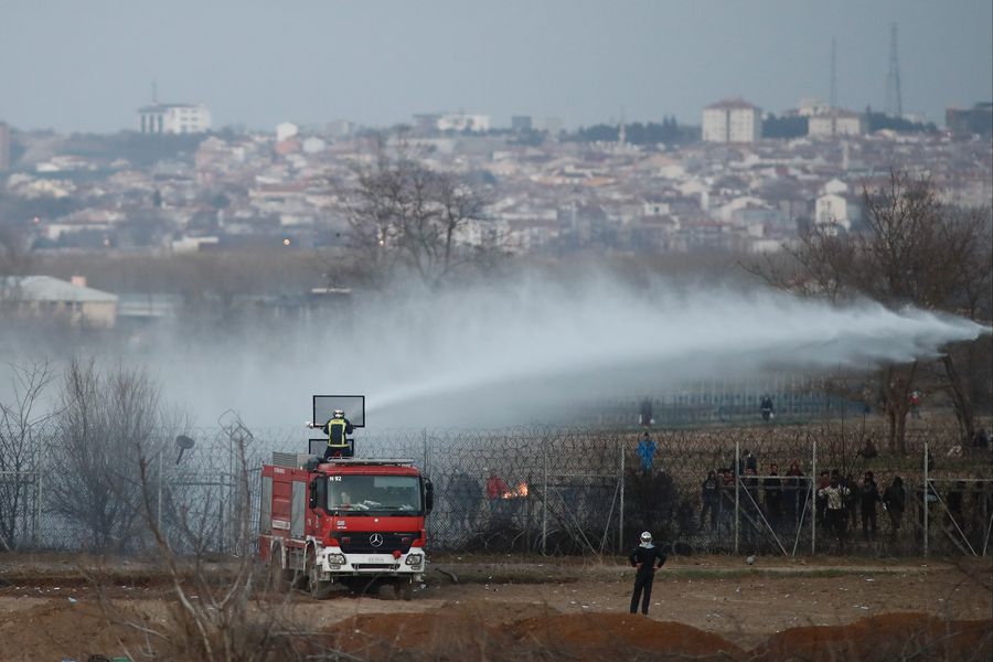 Greek firemen throw water to hold back migrants and refugees at the borderline between Greece and Turkey near the closed Kastanies border crossing in northern Greece, on March 7, 2020. (Photo by Dimitris Tosidis/Xinhua)