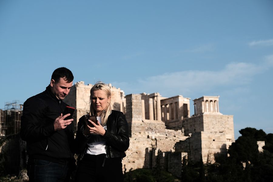 Visitors take pictures of the city of Athens on Filopappou hill in Greece, March 7, 2020. (Xinhua/Marios Lolos)