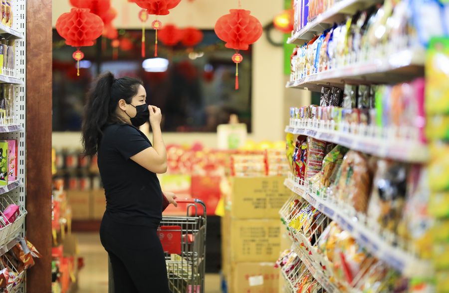 A customer wearing a face mask shops in a supermarket in Los Angeles, California, the United States, March 4, 2020.(Xinhua/Li Ying)