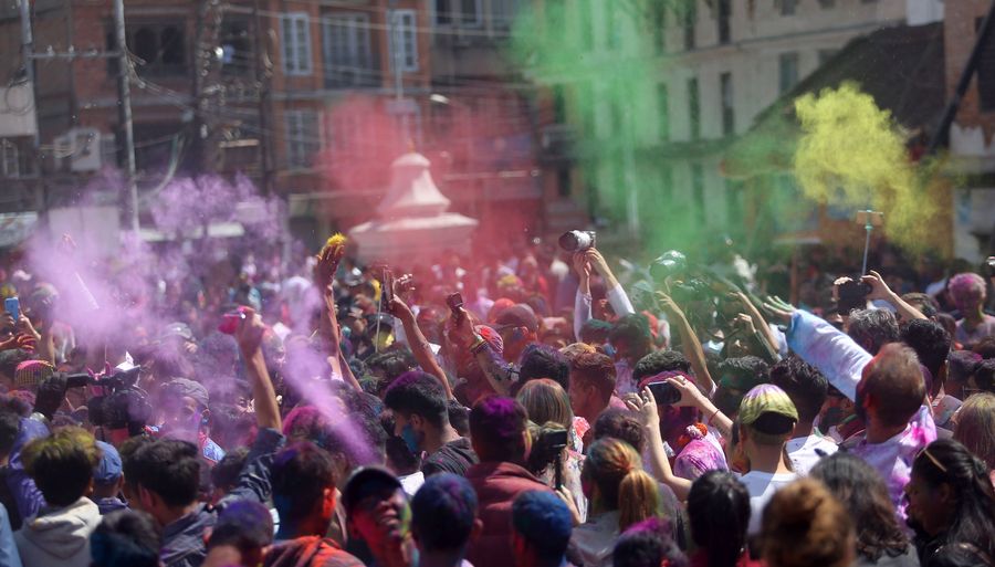 People participate in the celebration of Holi Festival in Kathmandu, capital of Nepal, March 9, 2020. (Photo by Sunil Sharma/Xinhua)