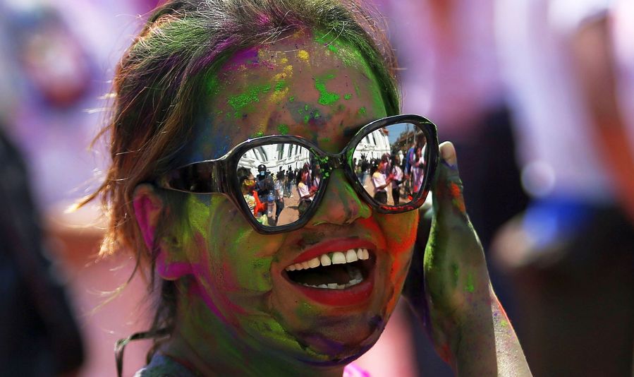 A girl participates in the celebration of Holi Festival in Kathmandu, capital of Nepal, March 9, 2020. (Photo by Sunil Sharma/Xinhua)