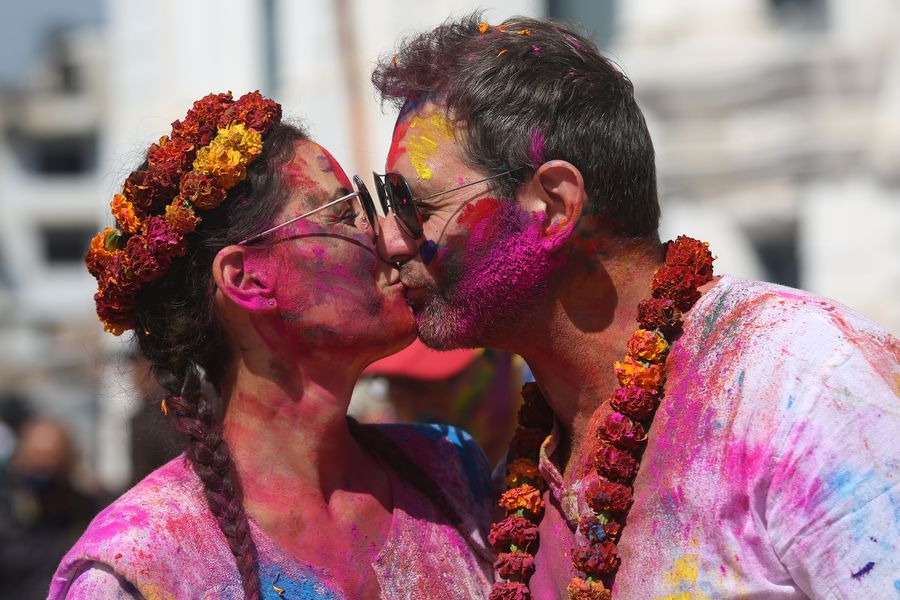 A couple kiss each other during the celebration of Holi Festival in Kathmandu, capital of Nepal, March 9, 2020. (Photo by Sunil Sharma/Xinhua)