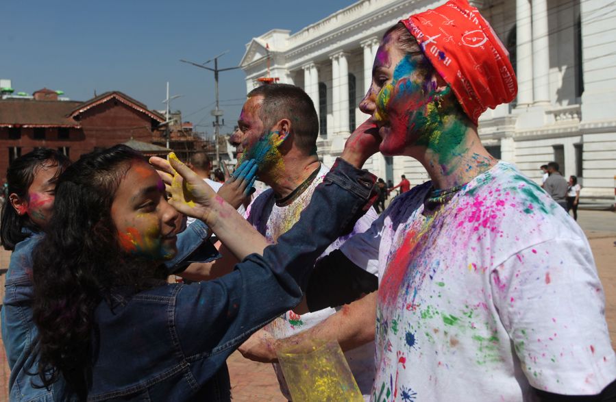 People put colour powder to each other in the celebration of Holi Festival in Kathmandu, capital of Nepal, March 9, 2020. (Xinhua/Sunil Sharma)