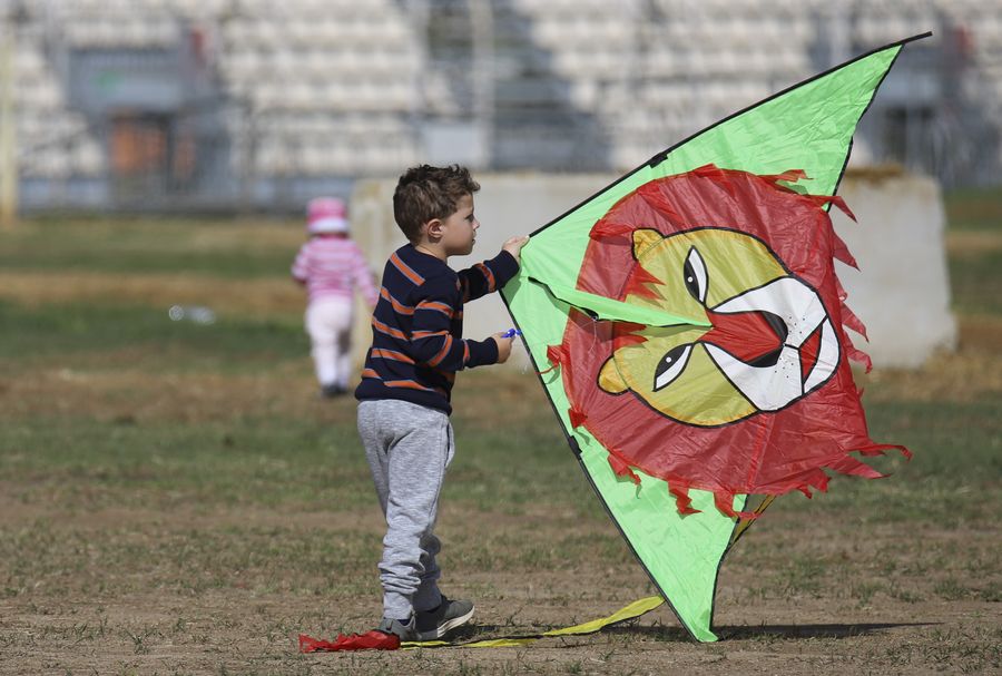 Photo taken on March 8, 2020 shows a boy holding a kite during a sunny day at the Exhibition Park in Canberra (EPIC), Canberra, Australia. (Photo by Liu Changchang/Xinhua)