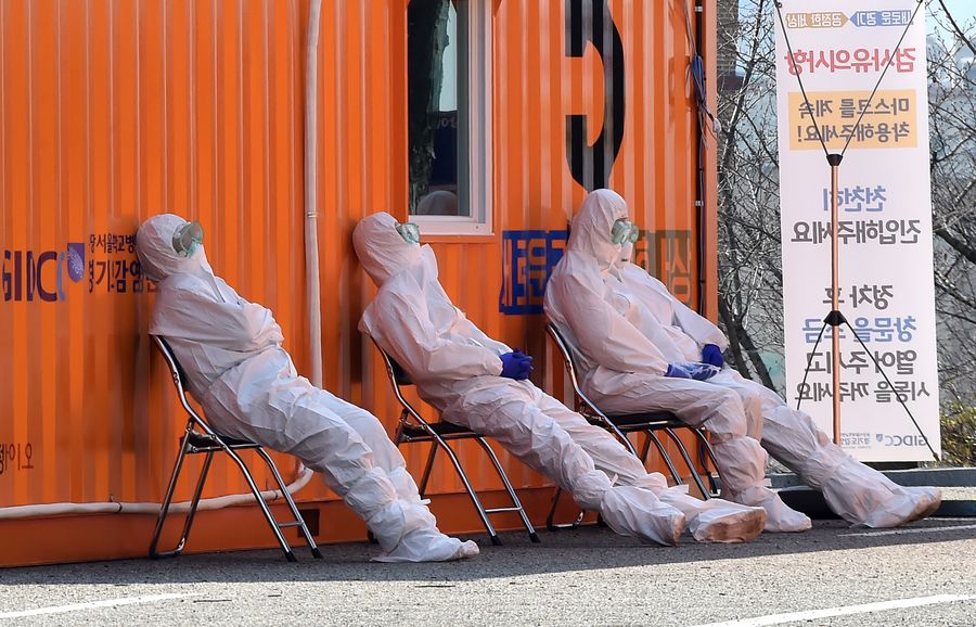 Medical workers rest at a screening clinic in Suwon, South Korea, March 8, 2020. South Korea confirmed 179 more cases of the COVID-19 on Sunday, raising the total number of infections to 7,313. (NEWSIS/Handout via Xinhua)