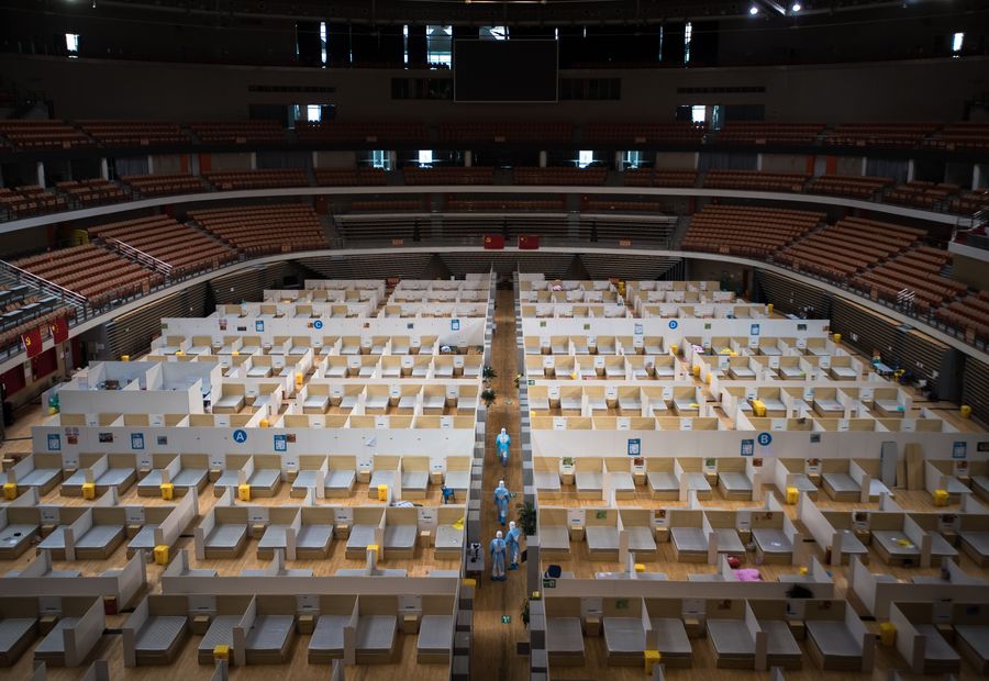Staff members clean up a makeshift hospital in Wuhan, central China's Hubei Province, March 8, 2020. The makeshift hospital converted from a sports venue was officially closed after its last batch of cured COVID-19 patients were discharged.(Xinhua/Xiao Yijiu)