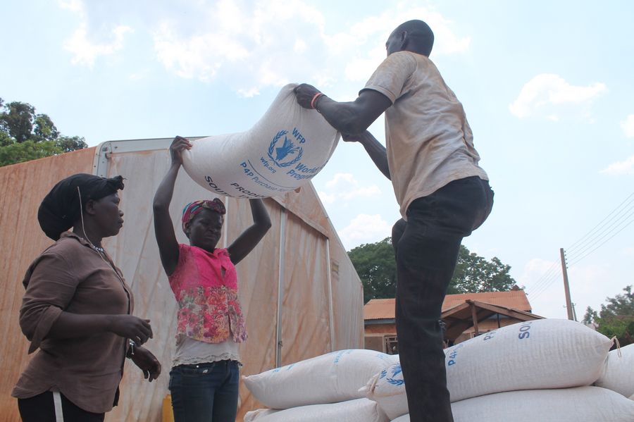 Laborers carry maize bags at a United Nations World Food Program (WFP) warehouse used to store locally produced grains in Yambio, South Sudan, on March 5, 2020. (Xinhua/Gale Julius)