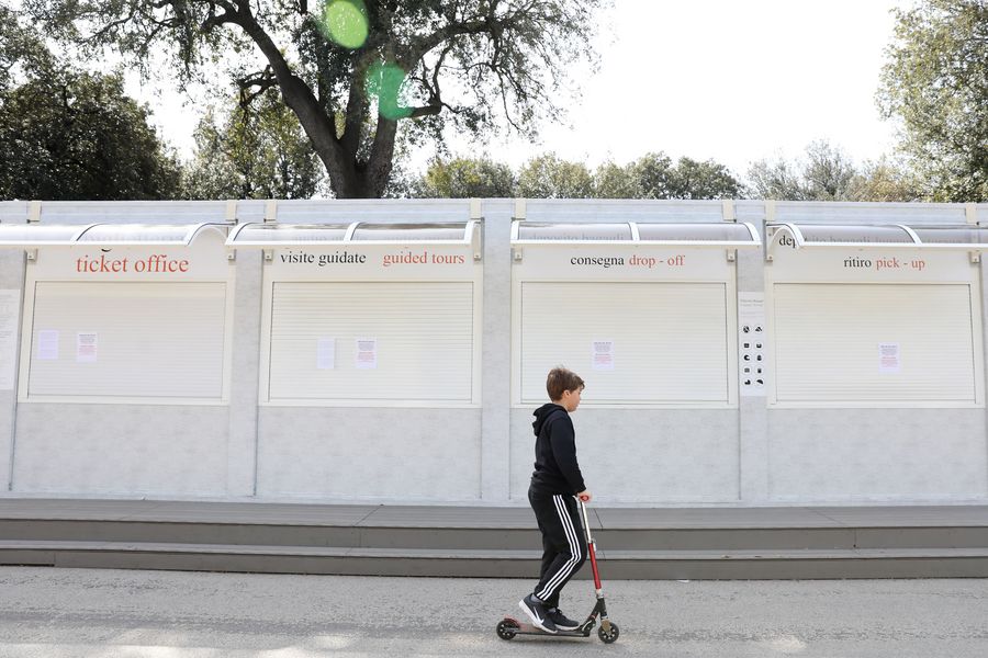 A boy plays in front of the ticket office of the closed Borghese Gallery and Museum in Rome, Italy, March 10, 2020. (Xinhua/Cheng Tingting)