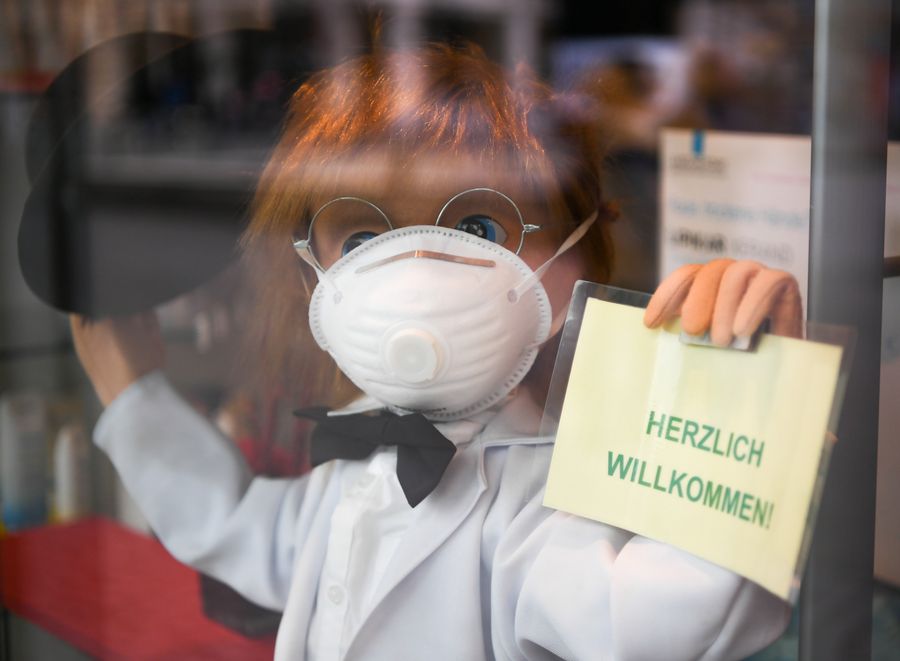 A puppet with a face mask on is seen at a pharmacy in Frankfurt, Germany, March 8, 2020.(Xinhua/Lu Yang)