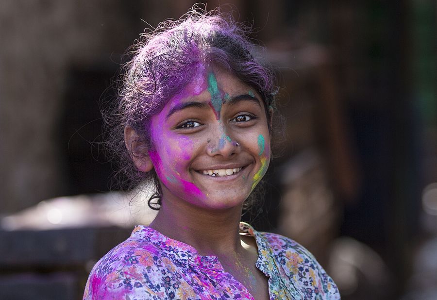 An Indian girl smeared with colours participates in the celebration of Holi in New Delhi, India, March 10, 2020.(Xinhua/Javed Dar)