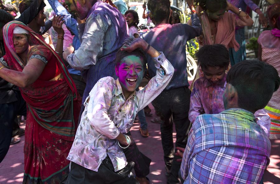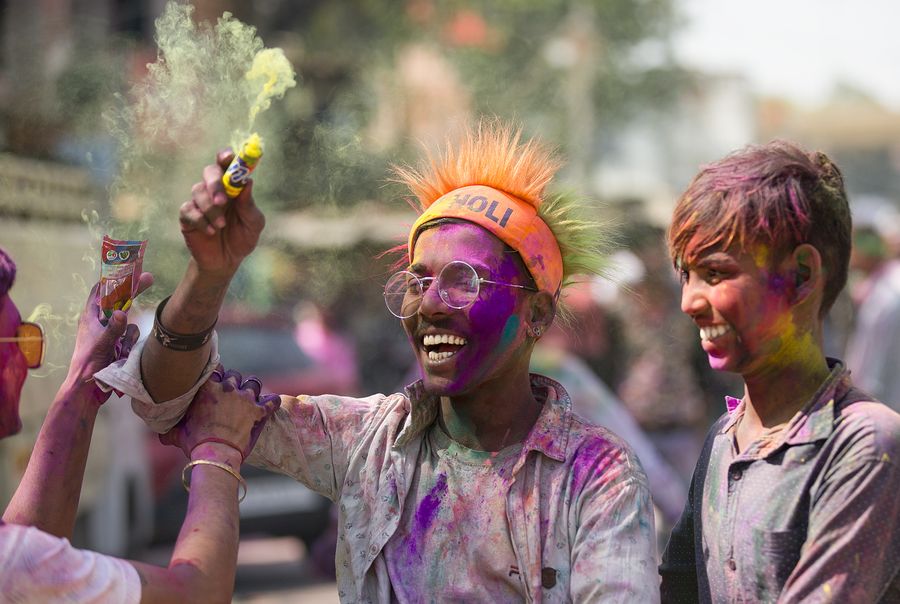 Indian children smeared with colours celebrate the festival of Holi in New Delhi, India, March 10, 2020. (Xinhua/Javed Dar)
