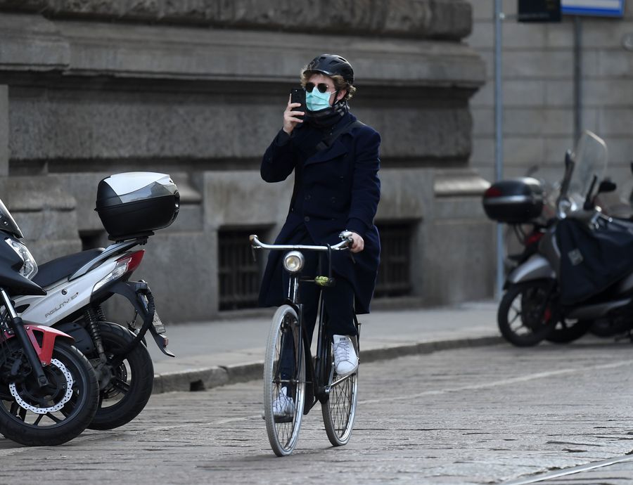 A man wearing a face mask rides a bicycle in Milan, Italy, on March 10, 2020. The novel coronavirus continued to spread in locked-down Italy on Tuesday, with authorities confirming that 8,514 people have tested positive and 631 have died since the epidemic first emerged in northern Italy on Feb. 21. (Xinhua)
