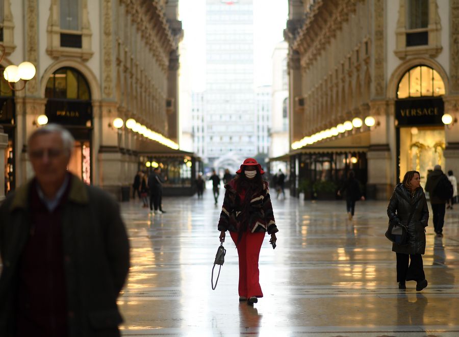 A woman wearing a face mask walks at the Galleria Vittorio Emanuele II in Milan, Italy, on March 10, 2020. (Xinhua)