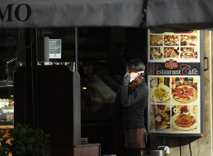 A woman wearing a face mask stands in front of a closed restaurant in Milan, Italy, on March 10, 2020. (Xinhua)