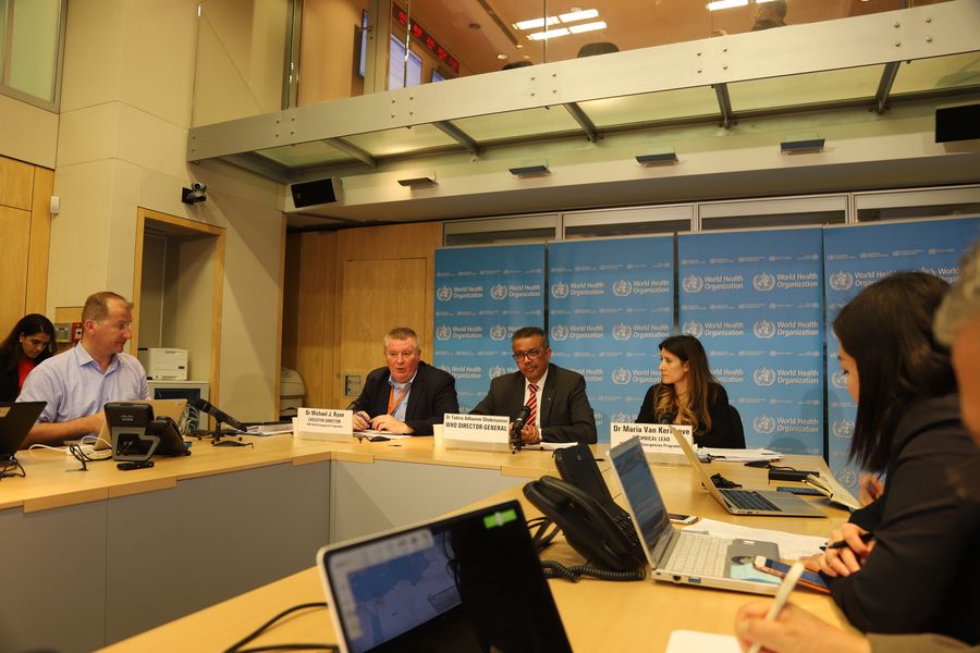 World Health Organization (WHO) Director-General Tedros Adhanom Ghebreyesus (C, Rear) attends a press conference in Geneva, Switzerland, on March 11, 2020. WHO said on Wednesday that the COVID-19 outbreak can be characterized as a "pandemic" as the virus spreads increasingly worldwide. (Xinhua/Chen Junxia)