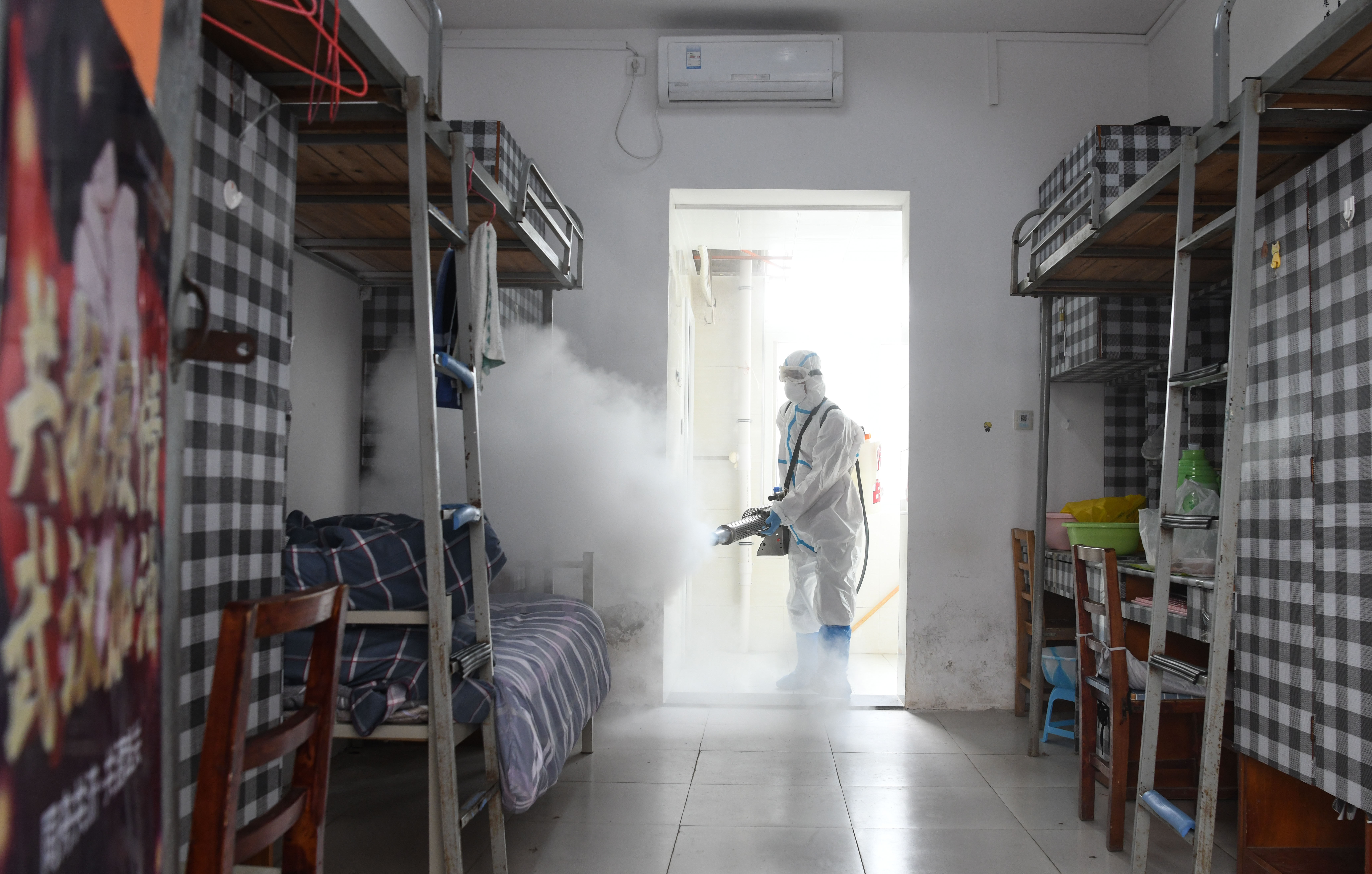 A volunteer conducts disinfection at an empty room of the quarantine venue based in the Wuhan Vocational College of Software and Engineering in Wuhan, central China's Hubei Province, March 10, 2020. (Xinhua/Cheng Min)