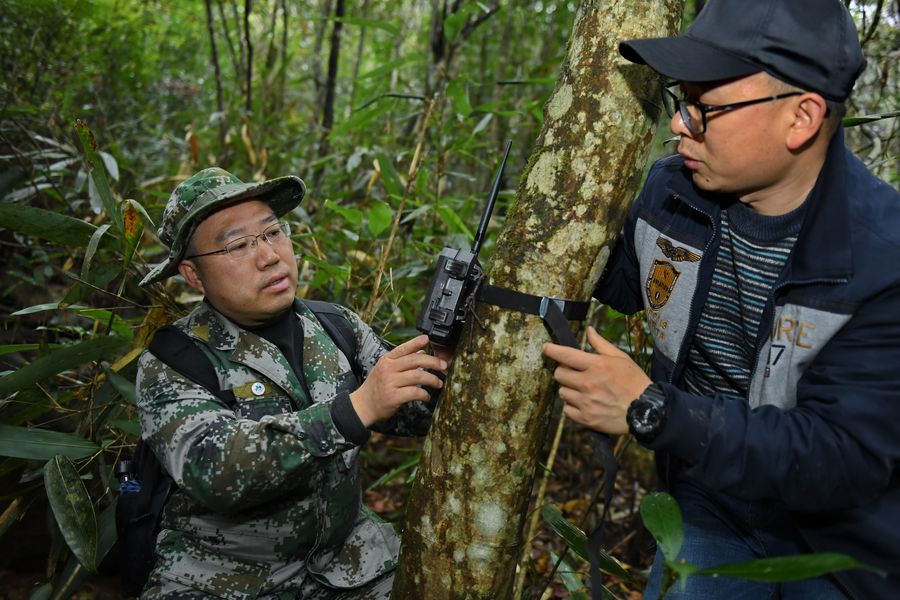 Researchers install an infrared camera to monitor wild animals at the Wuyishan National Park, southeast China's Fujian Province on Dec. 31, 2019. (Xinhua/Zhang Guojun)
