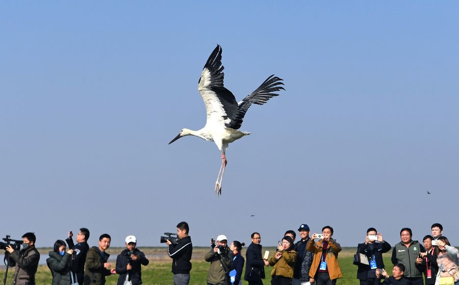 A white stork is released at the Jiangxi Poyang Lake National Nature Reserve in east China's Jiangxi Province, Dec. 8, 2019. (Xinhua/Wan Xiang)