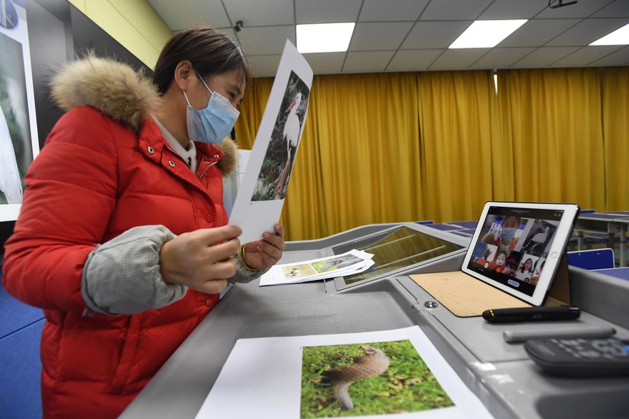 A teacher introduces the knowledge of wild animals via livestreaming class on internet at the No. 10 elementary school in Zhangshu City, east China's Jiangxi Province, March 2, 2020. (Photo by Zhou Liang/Xinhua)
