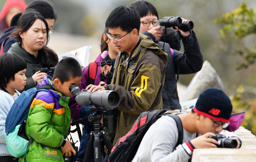 Children observe birds at the Minjiang River estuary wetlands in Fuzhou City, southeast China's Fujian Province, Jan. 19, 2020. (Xinhua/Wei Peiquan)