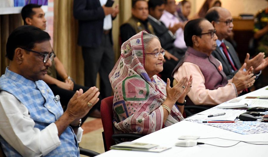 Bangladeshi Prime Minister Sheikh Hasina along with her cabinet members raise hands in prayer during the inaugural ceremony of the country's first express highway through a video conference from her official residence in Dhaka, Bangladesh, March 12, 2020. (PID/Handout via Xinhua)