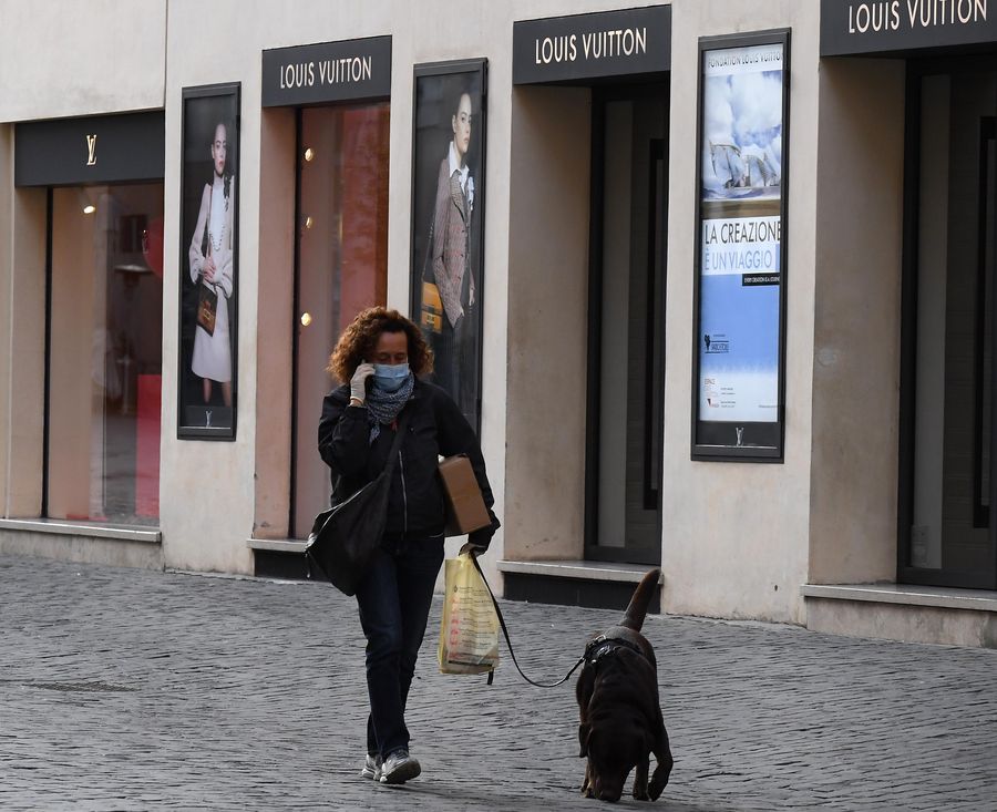 A woman wearing a face mask walks a dog on the shopping street Via dei Condotti in Rome, Italy, on March 12, 2020. (Photo by Elisa Lingria/Xinhua)