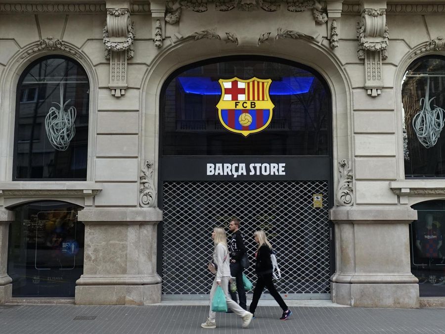 People walk past a closed Barca store in Barcelona, Spain, March 14, 2020. (Photo by Zhou Zhe/Xinhua)