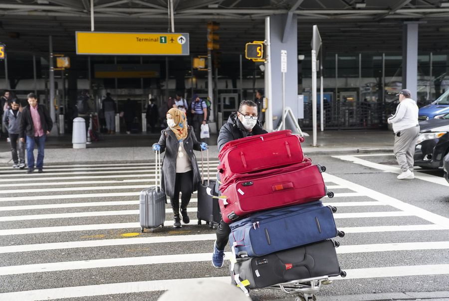 Arrivals walk out of Terminal 1 at John F. Kennedy International Airport in New York, the United States, March 13, 2020. The White House announced on March 14 that the United States is extending Europe travel restrictions to Britain and Ireland due to COVID-19, which will be effective on the midnight of March 16 eastern standard time. (Xinhua/Wang Ying)