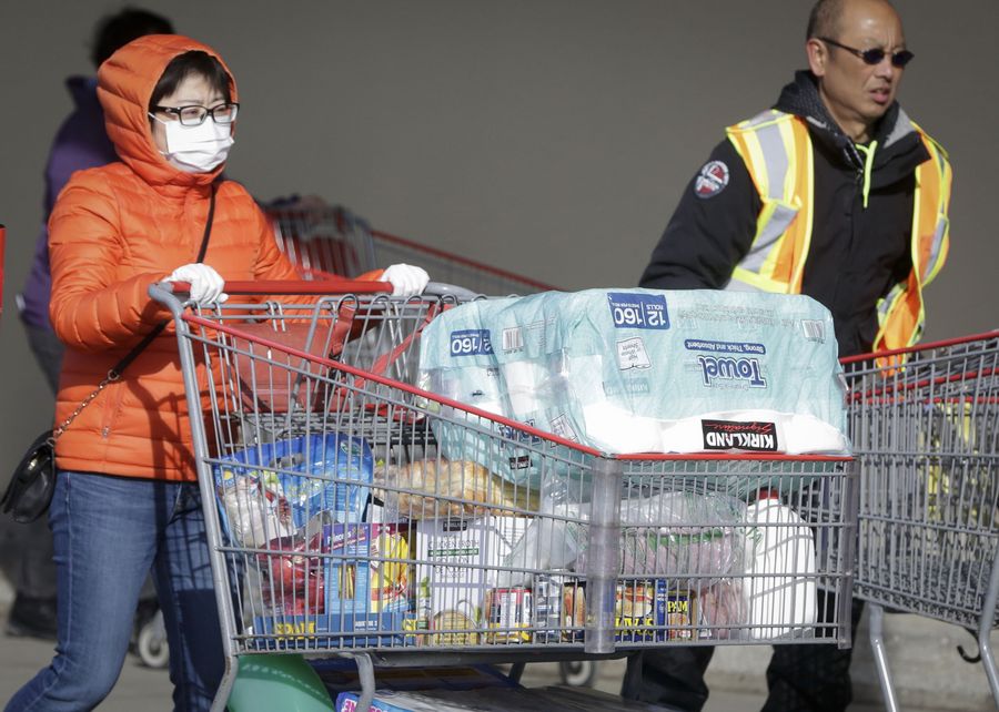 A shopper pushes a cart loaded with goods outside a Costco warehouse in Vancouver, Canada, on March 14, 2020. (Photo by Liang Sen/Xinhua)